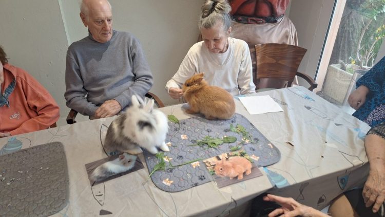 L’objectif de cette journée était clair : réunir les habitants de notre maison de retraite autour d’une activité commune le temps d’une douce après-midi. Dans la salle commune, les résidents se sont installés autour d’une grande table, dans une ambiance calme et chaleureuse. L’arrivée des lapins nains a immédiatement suscité curiosité et attention. Les mains se sont tendues, les regards se sont éclairés, et chacun a pu participer à son rythme. Ce format convivial, au cœur des espaces de vie, favorise les échanges et renforce la cohésion entre les résidents de l’établissement.